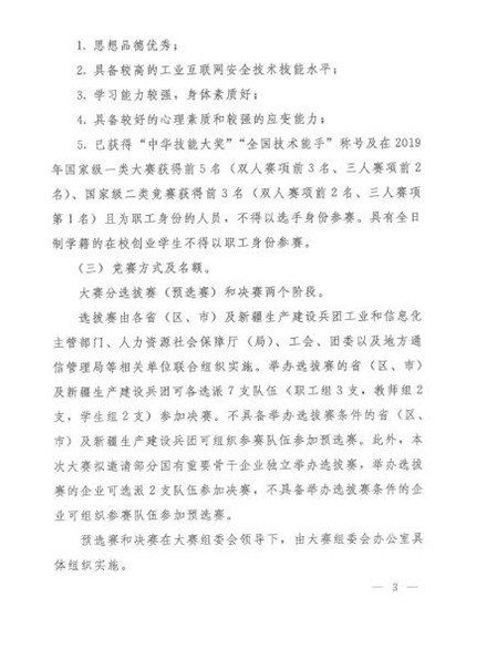 (一)请各省(区、市)及新疆生产建设兵团工业和信息化主管部门、通信主管部门以及国有重要骨干企业会同人力资源社会保障厅(局)、总工会、团委等相关部门,按照大赛组委会的统一部署,统筹考虑新冠肺炎疫情防控要求,认真做好组织工作,保证此次大赛顺利进行。