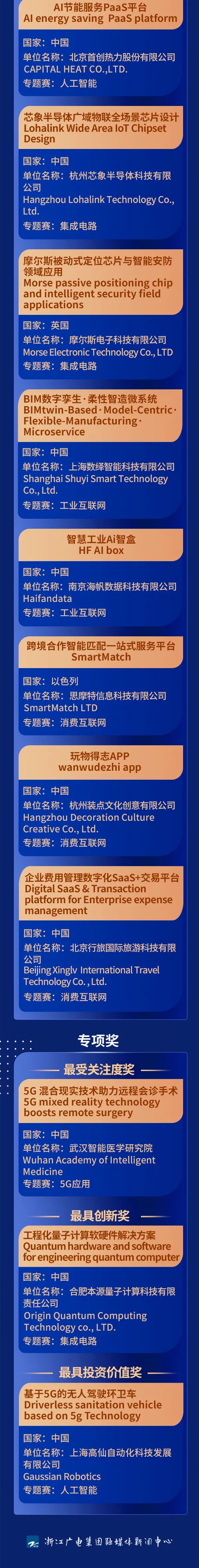 经项目团队激烈角逐和专家评委现场打分,最终排名结果出炉:亚组委的“杭州亚运会:泛5G智能场馆赛事应用”项目夺得5G应用专题赛一等奖,北京思灵的“思灵机器人”项目夺得人工智能专题赛一等奖,本源量子的“工程化量子计算软硬件解决方案”项目夺得集成电路专题赛一等奖,容知日新的“基于预测性维护的设备智能运维平台解决方案”项目夺得工业互联网专题赛一等奖,贝壳找房的“贝壳未来家”项目夺得消费互联网专题赛一等奖;以及10个二等奖项目、20个三等奖项目。大赛另设最具创新奖1名、最具投资价值奖1名、最受关注度奖1名。